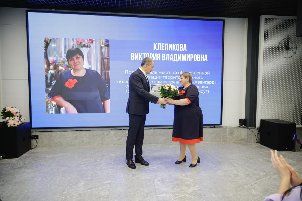 Сертификат вручает Губернатор Белгородской области В.В.Гладков председателю ТОС «Авангард» Клепиковой В.В.